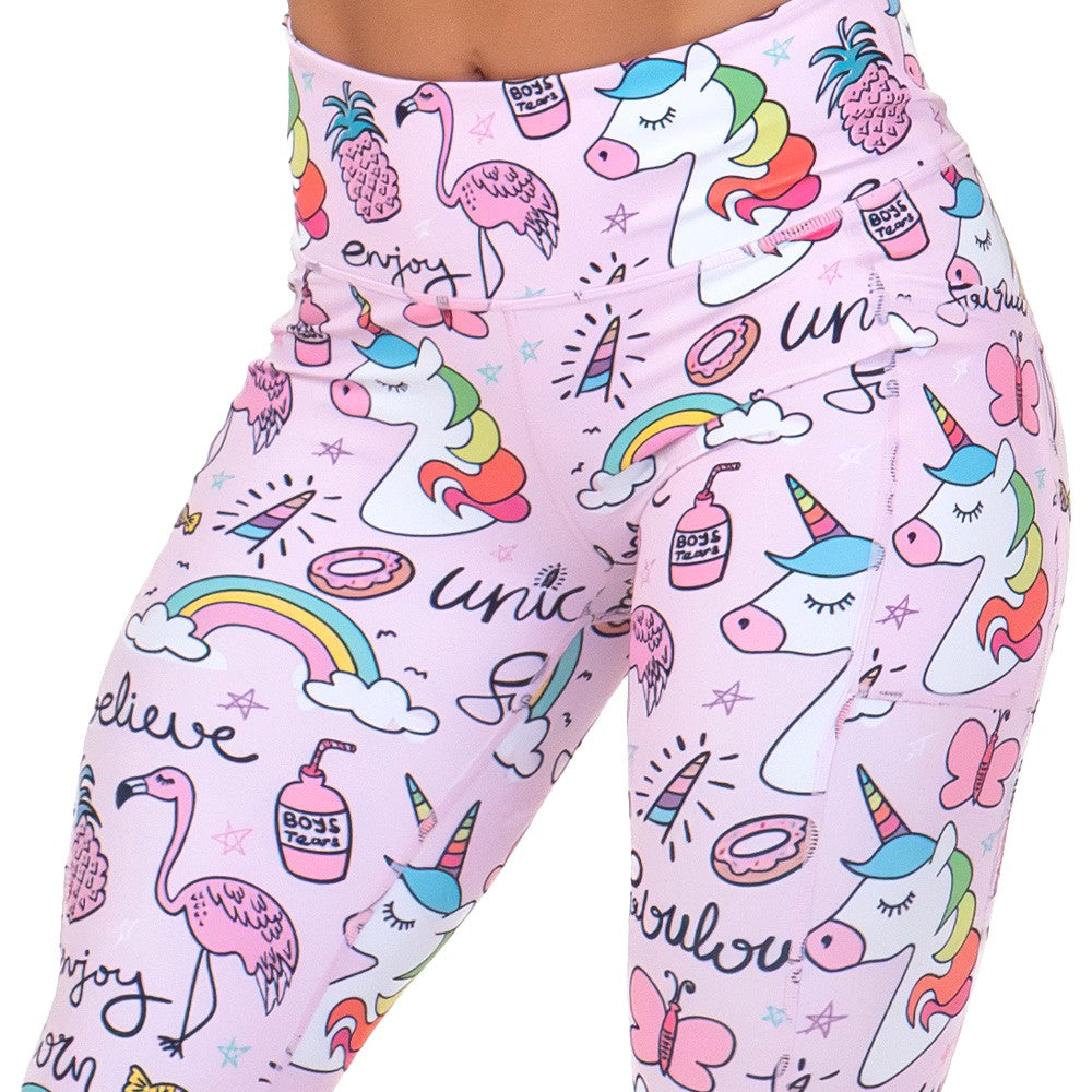Unicorn Leggings turn pure imagination into motion. layering playful unicorns. rainbows and pastel doodles across a soft pink backdrop for a look that feels bright. cheeky and full of charm.